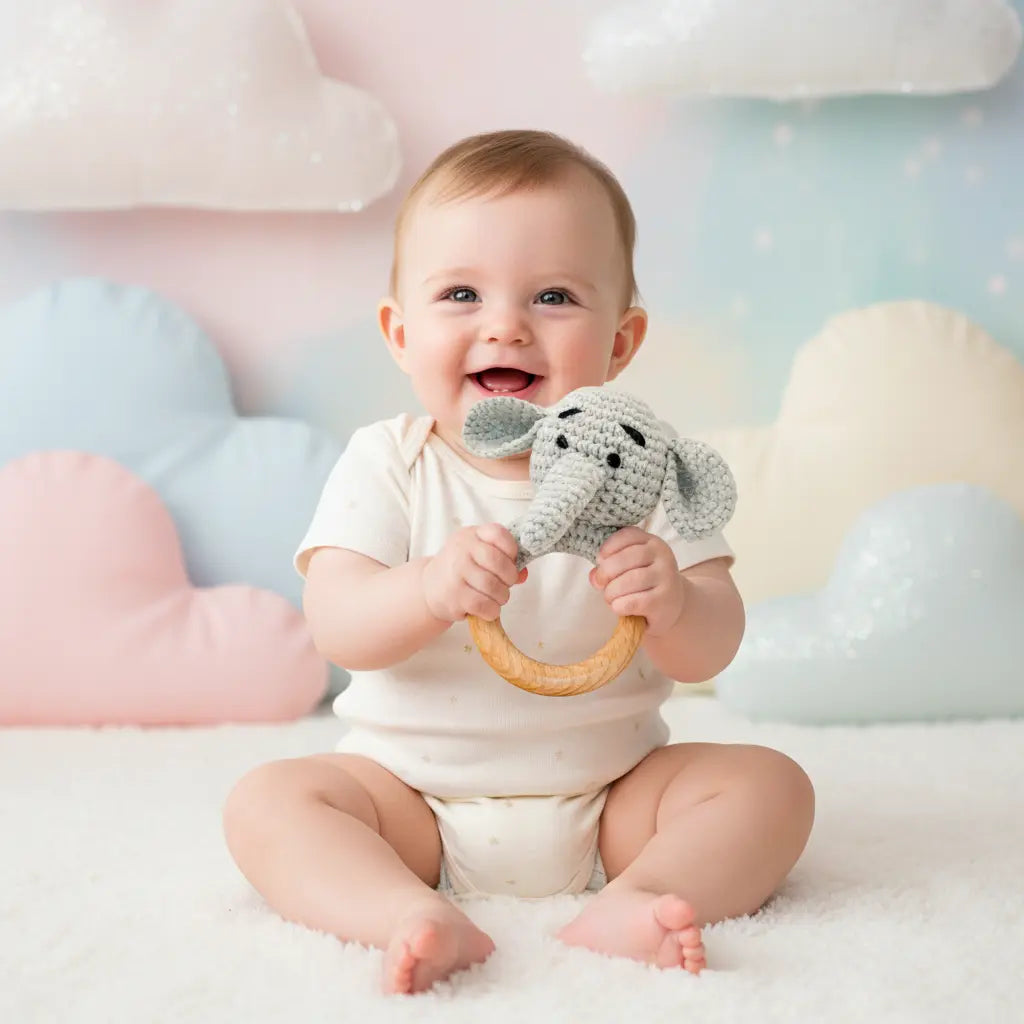 Introduce your baby to their new playful elephant friend with our Crochet Rattles - Elephant! Made from soft crochet material, this rattle also doubles as a gentle teether to soothe aching gums. Perfect for developing hand-eye coordination and sensory stimulation, this adorable elephant-shaped toy brings cozy companionship and fun to every playtime. Snuggle up with this delightful little elephant today!